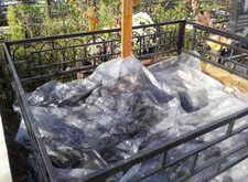 Сначала мы покрасили ограду, установили крест, положили брусчатку. Когда мы закончили укладку брусчатки пошел дождь, пришлось срочно накрыть ее пленкой. Это спасло ситуацию, если бы дождь залил брусчатку после укладки – это испортило бы работу, цемент забрызгал бы шероховатый камень, а избавиться от его следов практически невозможно.