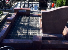 Облицевали бетон полированным гранитом, на территорию участка уложили брусчатку, предварительно приподняв памятник.